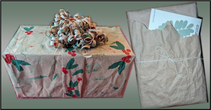 For wrapping, try newspaper or packing paper, and paint the package using non-toxic paint if desired. Linen sacks and handkerchiefs also make great, fully reusable wrapping options!